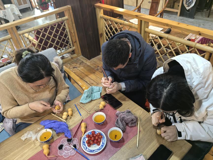 在随后的手工体验环节,女职工们围坐一堂,在茶香氤氲中开启了小葫芦篆刻创作。非遗传承人现场示范了篆刻技法,从选材、构图到刀法运用,细致讲解传统工艺的精髓。参与者们凝神运刀,将祝福语、姓名缩写或个性图案镌刻于葫芦表面,方寸之间尽显巧思。活动既考验耐心与创意,又让女同胞们在协作交流中增进情谊,现场欢声笑语不断。