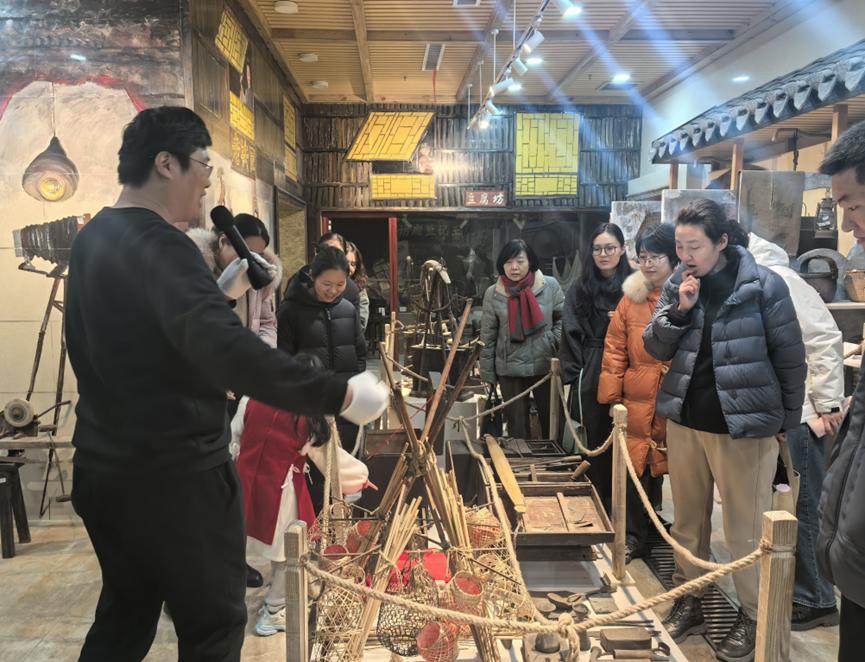 下午14时,活动在毓璜顶西路的璜山民艺博物馆拉开帷幕。女职工们首先参观了馆内丰富的民俗艺术藏品,从刺绣、木雕到传统服饰,每一件展品都诉说着胶东地区的历史文化与匠人精神。博物馆讲解员以生动的故事串联起展品背后的技艺传承,带领大家穿越时光,体悟传统工艺中的人文情怀与生活美学。