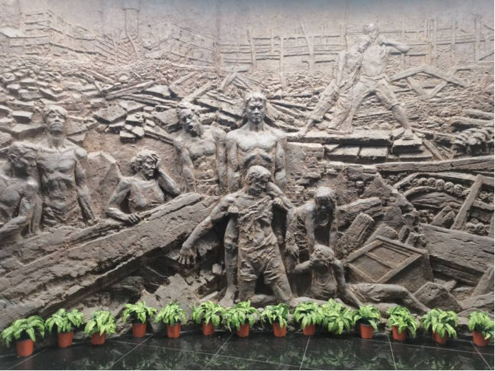 进入馆内,首先映入眼帘的是三块浮雕,这三块浮雕记录了地震发生时的情景:有被深埋废墟中的遇难者,有奋力挣扎的幸存者,有找不到亲人嚎啕大哭的儿童,又抱着死去亲人默默流泪的家属,有奋力搬动石头救援的解放军······浮雕无言,但似有言,将地震的惨烈,灾难的无情,生命的弱小,人民的无助,救灾者的英勇尽现眼前,似一章生死与共、风雨同舟的壮曲悲歌。
