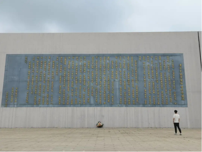 来到遗址公园门口,我们自觉戴好口罩,走进公园南门,一尊灰白色大理石雕像映入眼帘:支离破碎的表盘上,时针和分针定格在3时42分,像给游人述说这个黑色瞬间带给唐山的灭顶之灾。再走没多久,我就看见了一面刻满了字的墙,题头是唐山大地震罹难者纪念墙记,“……斯人类之巨殇,家国之巨痛,海内同哀,全民共咽”。