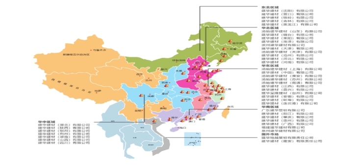 经过二十余年发展,不断地进行技术改造、革新、提高产品质量、扩大市场份额,逐步形成规模化经营,目前,建华建材产销量在中国市场占有率达30%以上。截止到2020年6月,建华建材集团在国内18个省(广东、福建、江苏、安徽、湖北、河南、湖南、山西、山东、辽宁、吉林、河北、四川、黑龙江、江西、浙江、陕西)2个直辖市(上海、天津)和1个自治区(广西)成立并投产了56处生产基地。紧紧抓住“长三角”、“珠三角”、“环渤海湾”三大区域经济增长点,在全国设有近300个销售服务网点,覆盖全国大部分区域。集团总人数约3万人,其中管理人员近4000 人。在加大全国布点,抢占市场制高点的同时,建华建材积极探索国外市场,并于2012年在越南成立首家海外生产基地,阔步走向世界。为更大程度地满足海外市场需求,2018年1月集团在越南成立第二家海外生产基地,目前,建华建材通过沿海沿江生产基地自建码头,产品销售可覆盖东南亚及周边各国。
