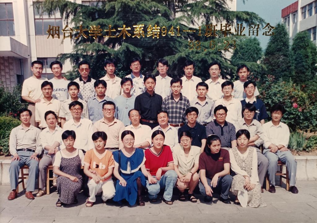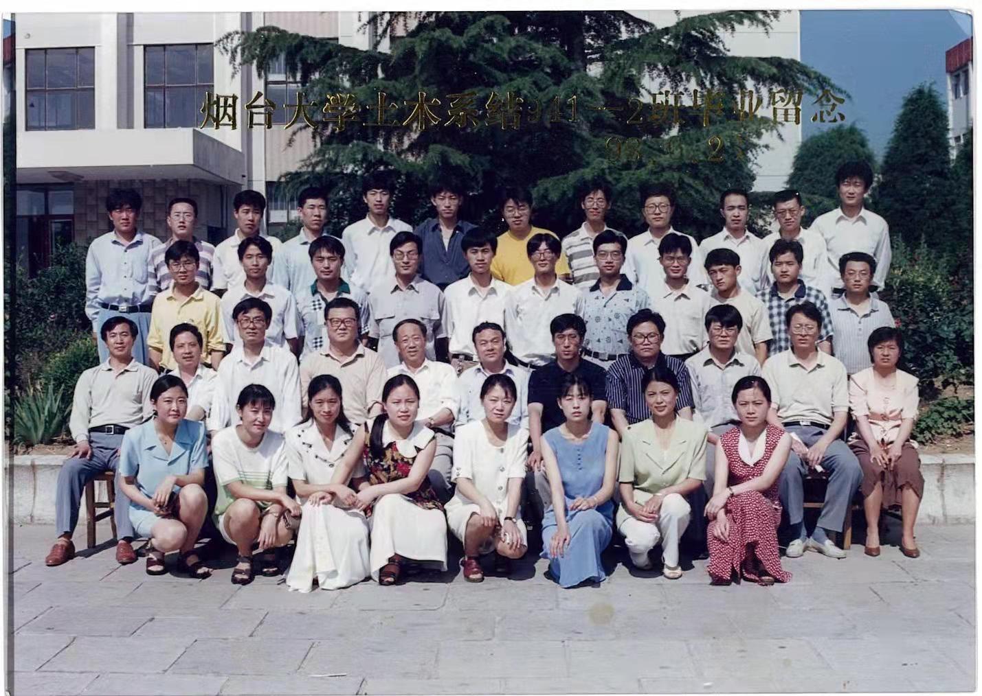 左起第二排:土木系辅导员吕永高、土木系教师曹振斌、土木系教师刘建新、土木系教师杜声扬、土木系书记张大虎、土木系主任姜继圣、土木系副主任邢纪波、土木系教师李相然、土木系教师吴广珊、土木系副主任周新刚、土木系班主任曲淑英(女)